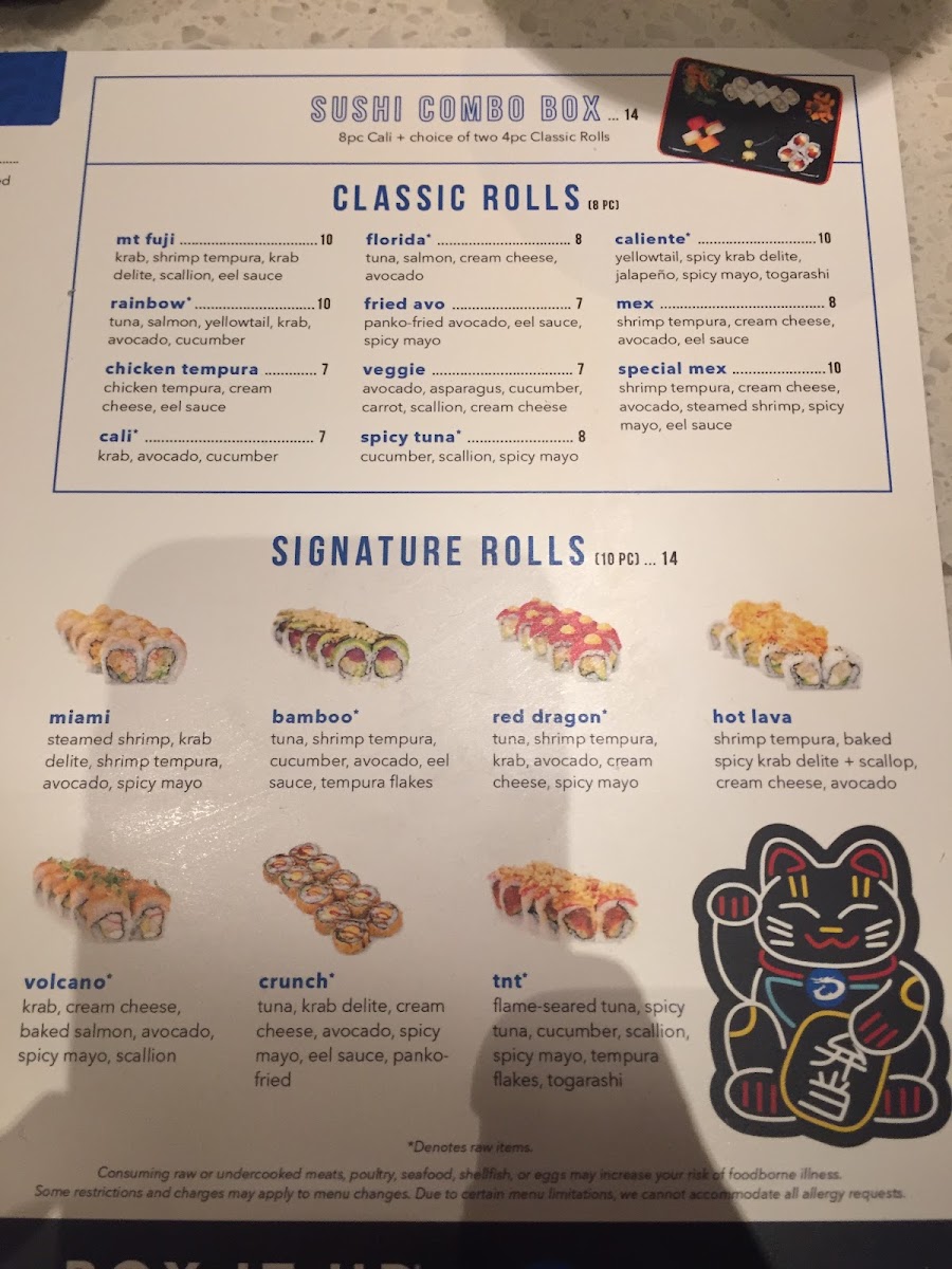 64 pieces of hand-crafted sushi rolls. Includes x2 Cali Roll, x2 Mex Roll, x2 Chicken Tempura Roll, x2 Veggie Rolls